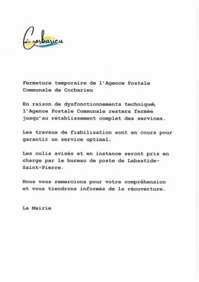 Fermeture temporaire de l'Agence Postale en raison de dysfonctionnements techniques
